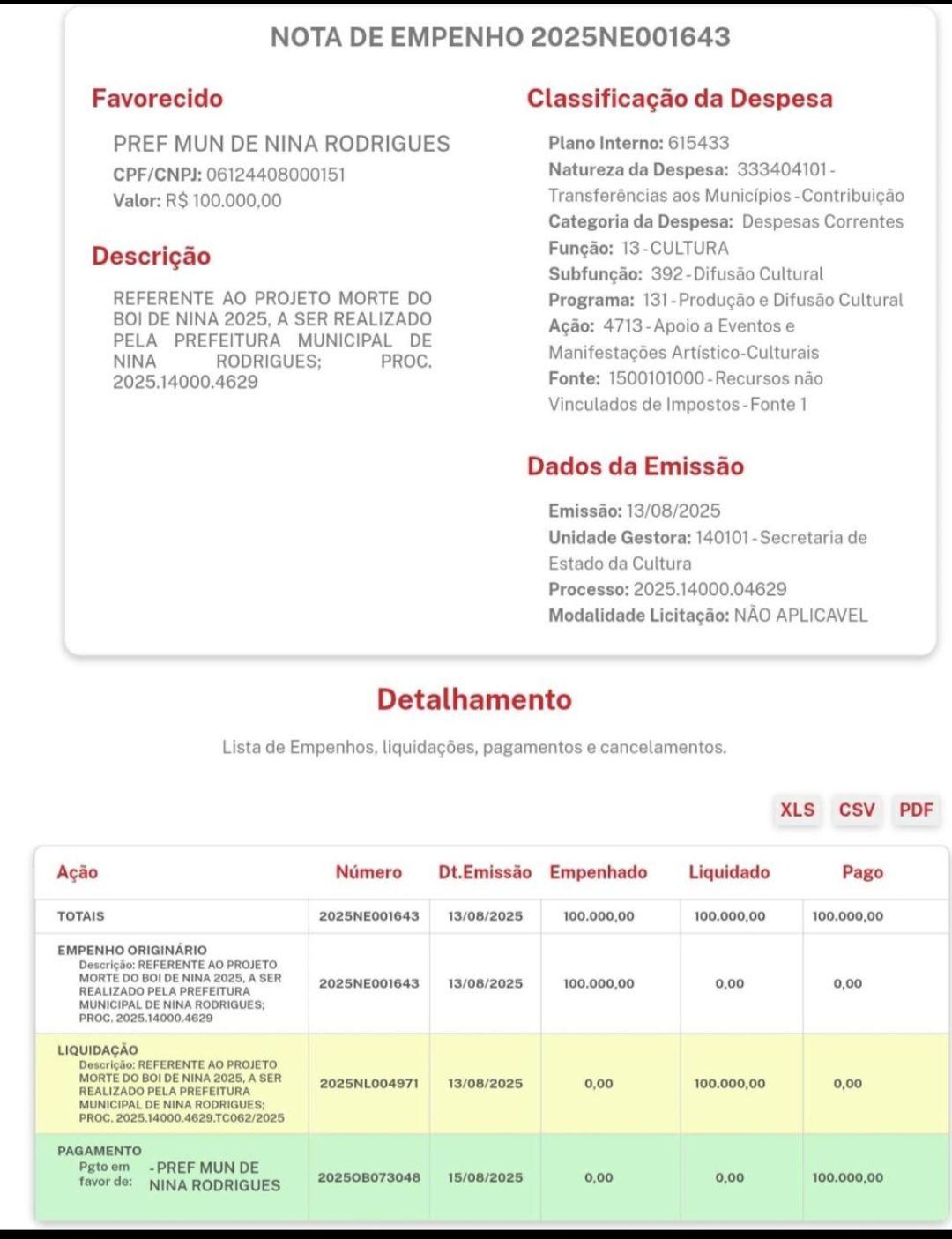 pagamento de R$ 100 mil ao Boi de Nina Rodrigues por apenas uma apresentação.